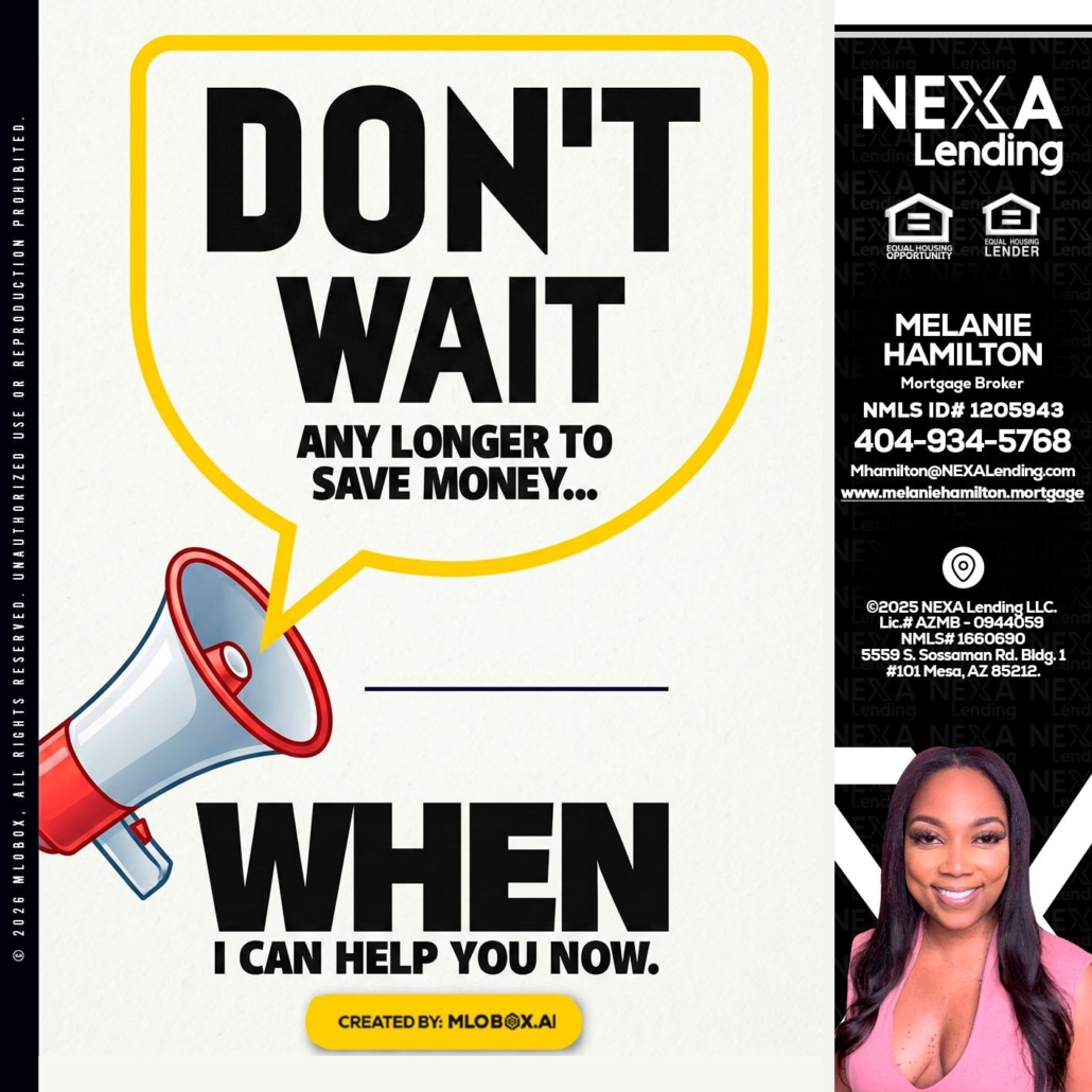 DONT WAIT - Melanie Hamilton -Loan OfficerHi, my name is Melanie Hamilton. I’m a Loan Officer with NEXA Lending LLC., offering personalized mortgage solutions, fast customized quotes, great rates and service with integrity.