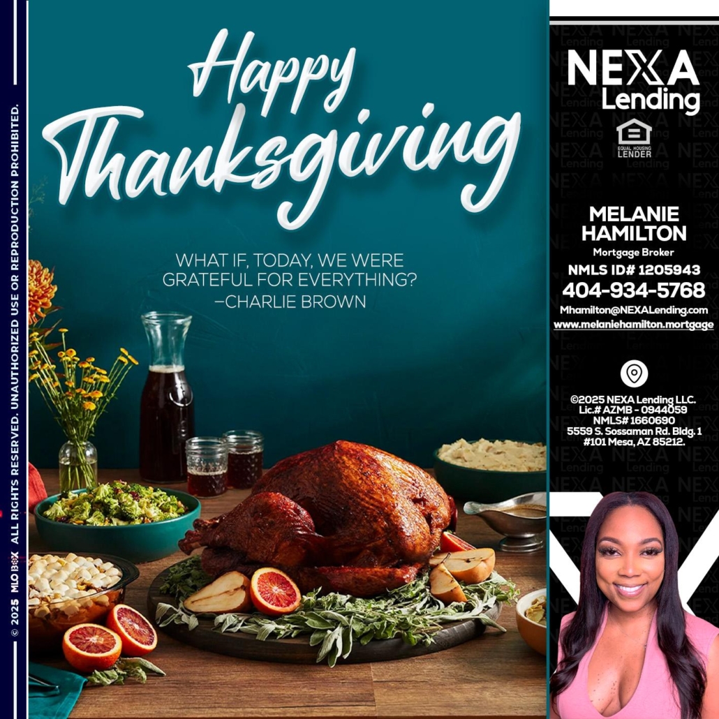 happy Thanksgiving - Melanie Hamilton -Loan OfficerHi, my name is Melanie Hamilton. I’m a Loan Officer with NEXA Mortgage LLC., offering personalized mortgage solutions, fast customized quotes, great rates and service with integrity.