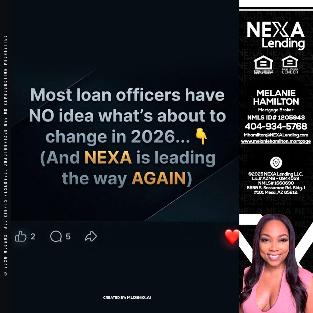 most loan officers - Melanie Hamilton -Loan OfficerHi, my name is Melanie Hamilton. I’m a Loan Officer with NEXA Lending LLC., offering personalized mortgage solutions, fast customized quotes, great rates and service with integrity.
